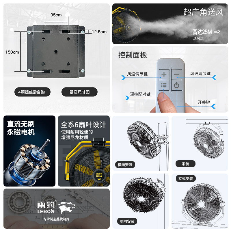 精准送风覆盖广,降温效果显著:采用空气动力学优化扇叶设计,大扇叶直径超远送风,送风距离达到25M;支持7档遥控机械控制,可精准匹配不同岗位的降温需求,通过加速空气流动实现高效体感降温,让员工快速摆脱高温困扰;