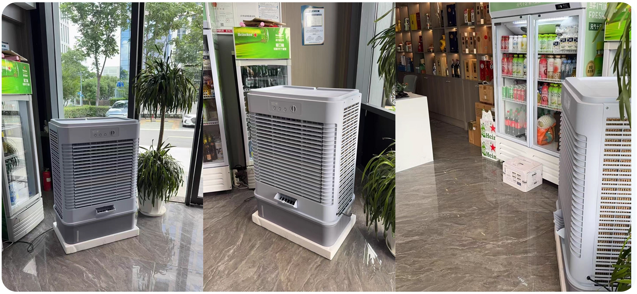 结合超市大厅、商店大厅挑高开阔、人流密集、出入口频繁开合、需兼顾降温与形象展示的核心需求,该连锁品牌经过多轮对比测试,最终选定雷豹冷风机EC5324D作为大厅通风降温制冷设备,根据不同门店大厅的面积大小与布局特点,完成12台设备的采购与精准部署(其中大型超市大厅各部署3台,4家社区商店大厅各部署1-2台)。
